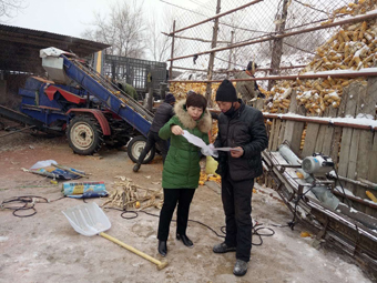 2018年1月9日,伊通镇农机技术推广站工作人员,李欣燃、刘艳辉两名同志顶着风雪下乡排查农机安全隐患。来到永新村正赶上农机户陈云山等四人正在使用脱粒机和传送带,将玉米装车准备运往收粮点。李欣燃和刘艳辉两名同志进前详细询问了农机具的使用情况,脱粒机要放平稳、禾把要握紧,大小要合适等脱粒机的使用细节,随后农机站工作人员又对农机具操作人员及驾驶员上路行驶进行农机安全知识宣传。为确保我镇农机安全零事故,伊通镇农机站全体工作人员将继续努力,为我伊通县农机人树立安全榜样,正当标兵。