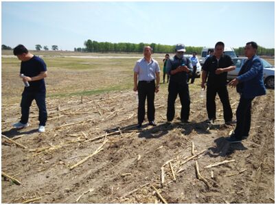 至5月21日,洮南市承担实施的秸秆全覆盖保护性耕作任务面积免耕播种作业全部结束,陆续发芽出苗,图为市农机局局长孙春来及分管领导带领技术人员踏查播种后的保护性耕作地块。 |